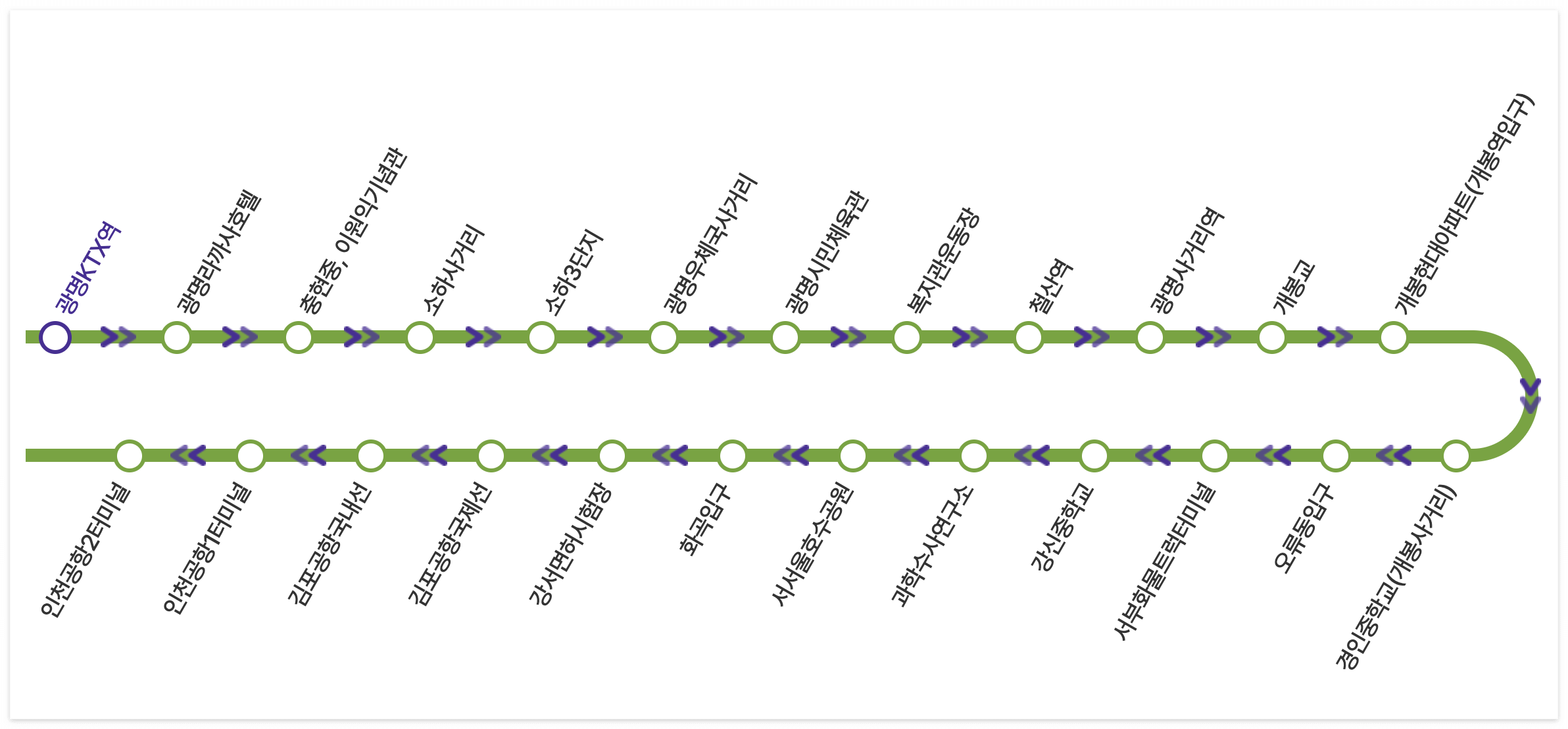 <광명 KTX역 - 광명라까사호텔 - 충현중 - 소하사거리 - 소하 3단지 - 광명우체국사거리 - 광명시민체육관 - 복지관운동장 - 철산역 - 광명사거리 - 개봉교 - 개봉현대아파트 - 경인중학교 - 오류동입구 - 서부화물트럭터미널 - 강신중학교 - 과학수사연구소 - 서서울호수공원 - 화곡입구 - 강서면허시험장 - 김포공항국제선 - 김포공항국내선 - 인천공항 1 터미널 - 인천공항 2 터미널> 순으로 운행합니다.